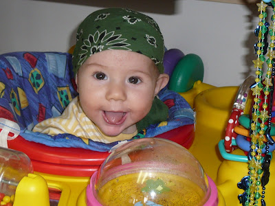 Now, it's bedtime. We're playing Dance Dance Revolution. It's never been at our house before; this game system belongs to the library. Orion put himself to sleep in Ben's arms, gnawing on his green bandana. It's been bringing him great joy all evening.
